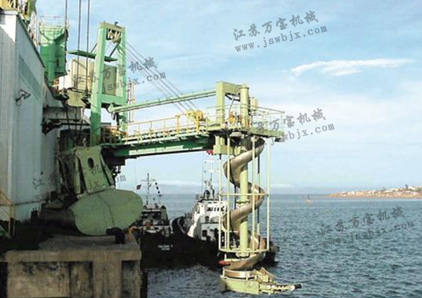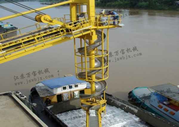 滑槽式裝船機(jī)的裝船能力一般在每小時(shí)100噸左右,最大也不超過每小時(shí)150噸。過大的速度會(huì)易造成袋物在帶式輸送機(jī)上堵塞,嚴(yán)重時(shí)會(huì)因袋物在過大傾角的螺旋滑槽上強(qiáng)烈下沖造成包裝袋破裂,所以在設(shè)計(jì)選型中不要盲目追求裝船能力以免帶來意想不到的不良后果。