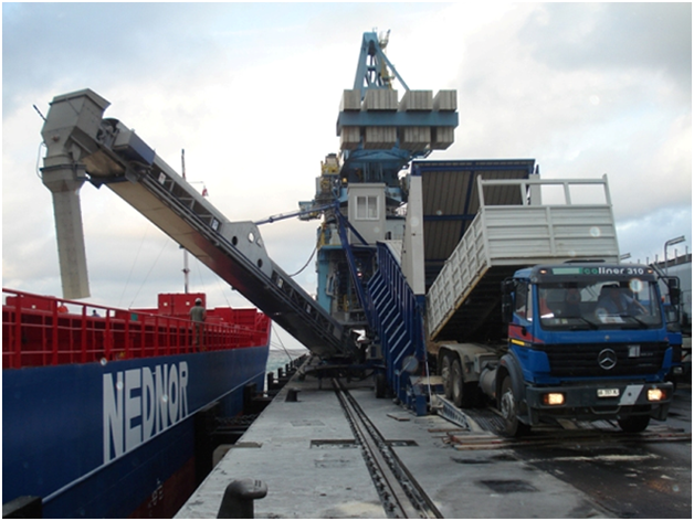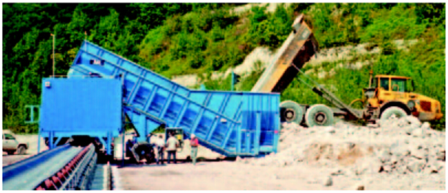 裝船機(jī)進(jìn)料口一般在輸送帶上方,位置很高,自卸卡車(chē)卸貨時(shí)車(chē)廂后部位置很底;采用裝載機(jī)雖然能將物料送到一定高度,但效率很差;裝船機(jī)能力一般很大,要確保裝船機(jī)的運(yùn)行效率,須有多輛運(yùn)輸車(chē)為其供料,最大限度地提高系統(tǒng)的處理速度和使車(chē)輛定位延遲效應(yīng)最小化,且具備穩(wěn)流功能,保證連續(xù)、均勻、平穩(wěn)地供料;自卸卡車(chē)每車(chē)二三十噸,要讓車(chē)子迅速卸貨,須提供緩沖儲(chǔ)存裝置;輸送帶水平段要有很大的強(qiáng)度,承受物料對(duì)進(jìn)料裝置的強(qiáng)烈沖擊;進(jìn)料裝置與裝船機(jī)要能有分有合,移動(dòng)時(shí)要同步,具有移動(dòng)的靈活性;該裝置可以輕松遷移到其它港口處,從而提升設(shè)備的利用率;當(dāng)輸送有塵物料時(shí),可配套高效的除塵設(shè)施。